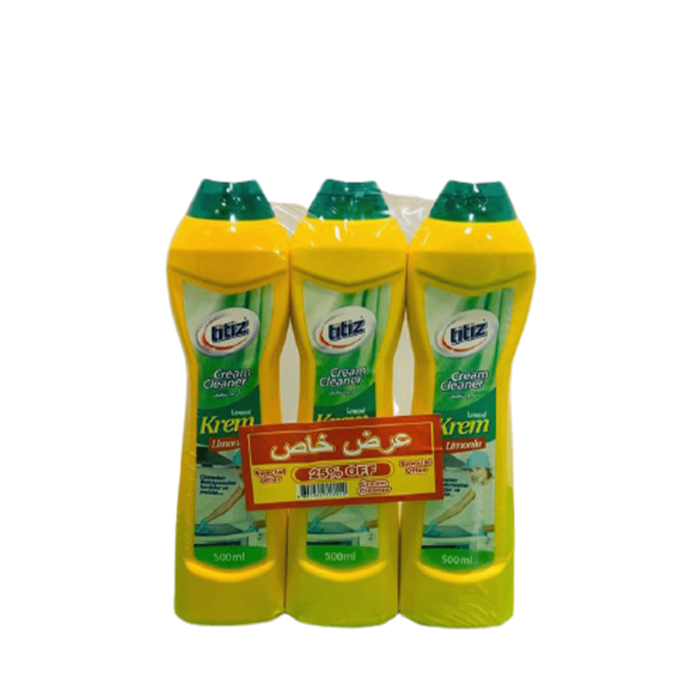 تيتيز كريم تنظيف الأسطح بالليمون – 500 مل × 3 هو منظف فعال ومناسب لمختلف الأسطح في المنزل، يوفر نظافة عميقة ولمعانًا مع رائحة ليمون منعشة، ويأتي في عبوات اقتصادية تفي باحتياجات التنظيف لفترة طويلة.